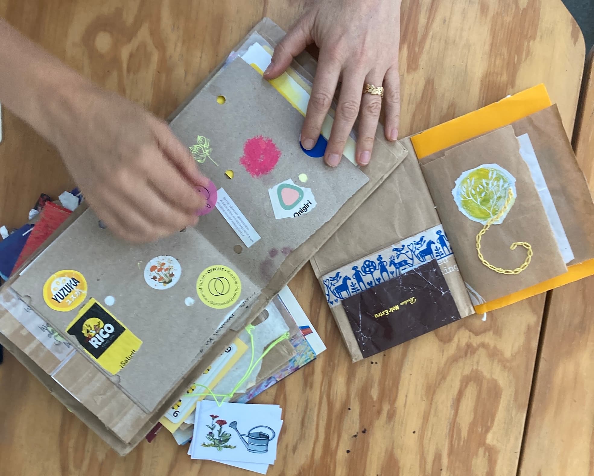 Das Buch “The Artist’s Way” von Julia Cameron inspiriert und begleitet zurzeit Annette in ihrer Kreativität. In selbst gestalteten Journals aus Papiertaschen hält Annette persönliche Momente zeichnerisch fest. „Das Leben durch Zeichnen verstehen. Wenn ich zeichne, habe ich das Gefühl und die Gewissheit, dass ich an diesem Ort war und diesen Moment erlebt habe.“ Zusammenfassungen von Blogs und Podcasts, Blumen aus der Crêperie, das Warten vor dem Sushi-Laden, Kreissammlungen … Die Seiten in den Journals erzählen verschiedene Geschichten. Es wäre schön, wenn solche Journalings auch gemeinsam in einer Gruppe stattfinden könnten. Jede Person würde das Journal auf ihre eigene Art gestalten. Bei solchen Treffen könnten sich die Künstlerinnen untereinander austauschen, aber auch völlig in ihr Projekt eintauchen. Annette möchte gerne einen solchen Rahmen bieten. Interesse wäre jedenfalls vorhanden. Das motiviert. Die konkrete Umsetzung muss nun in Angriff genommen werden.