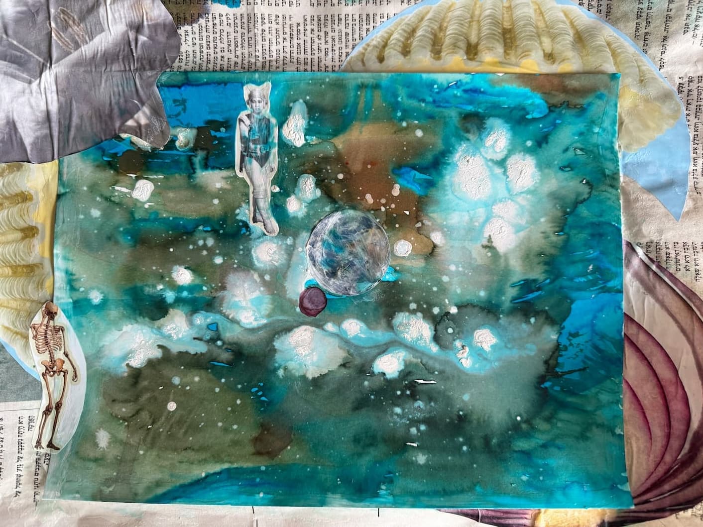 „Mut zur Weite” steht bei Sunita im Fokus. Nach 20 Jahren widmet sie sich wieder ihrer Liebe zum Singen und erkundet zugleich neue Formen des bildnerischen Ausdrucks. Die gezeigte Collage entstand an einem gemeinsamen Abend mit einer Frauengruppe unter der Leitung einer Kunsttherapeutin. Wie sich das auf ihren Tanz auswirken wird, weiss sie noch nicht. Aber das wird es bestimmt. Aktuell stehen keine konkreten Projekte an. Das lässt Raum, sich für Neues zu öffnen. Aber ist es eigentlich in Ordnung, sich verschiedenen Kunstformen zu widmen? Sollte man sich nicht nur auf eine konzentrieren, um darin gut zu werden? Wir glauben nicht. Das künstlerische Schaffen muss nicht immer Exzellenz anstreben. Es kann auch einfach Freude bereiten. Sich einer neuen Kunstformen anzunehmen, ist eine Bereicherung für die andere Kunstform. Das Singen wird das Tanzen bereichern und umgekehrt. Wir müssen uns nicht beschränken, wenn unsere Interessen es nicht tun.